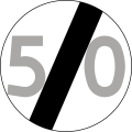 A greyed-out version of the speed limit sign, with diagonal black stripes, indicates the end of that particular speed restriction – after passing it, the general speed limit for that type of road applies.